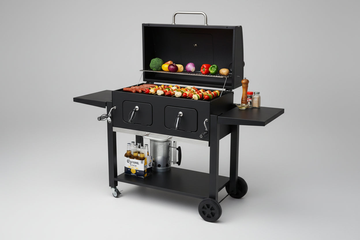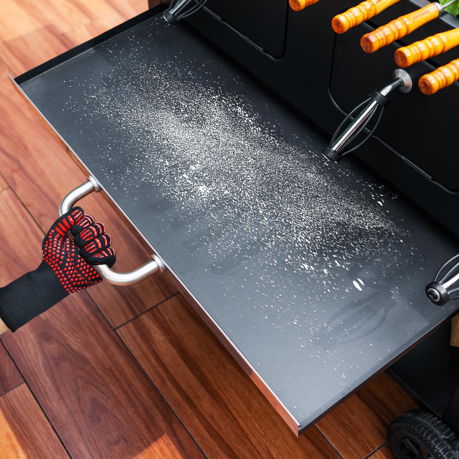 The front charcoal access door makes it easy to add charcoal during cooking, and the full-sized removable draw-out ash tray ensures hassle-free cleanup. Two large foldable side tables offer ample space for food prep and accessories, and the fold-down design allows for easy storage when not in use.