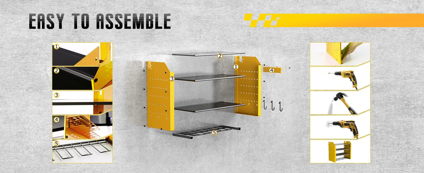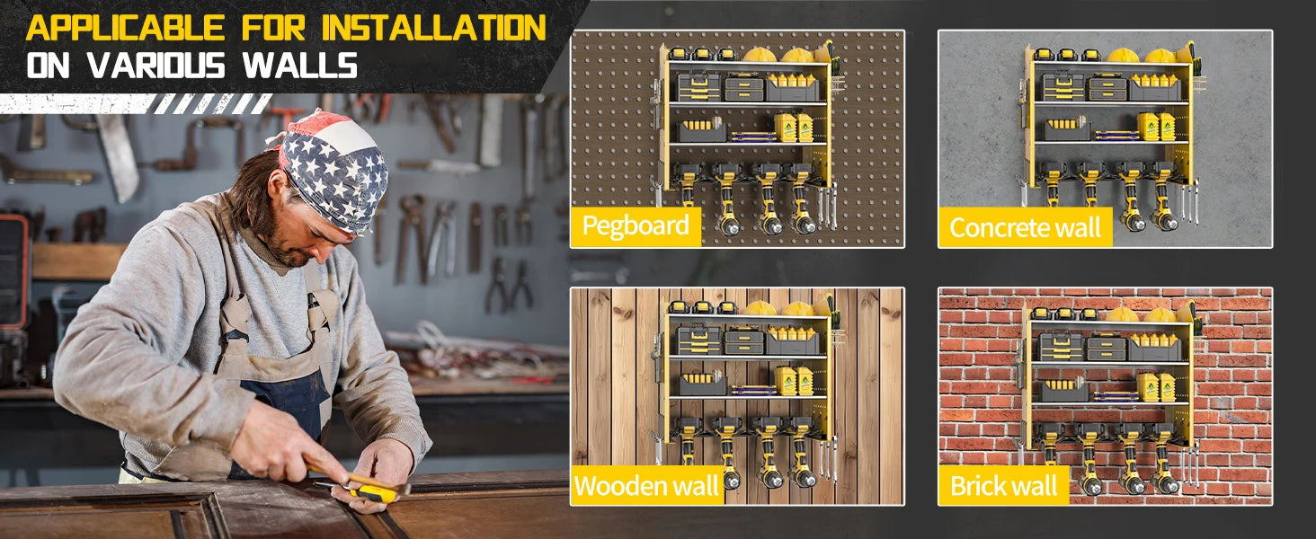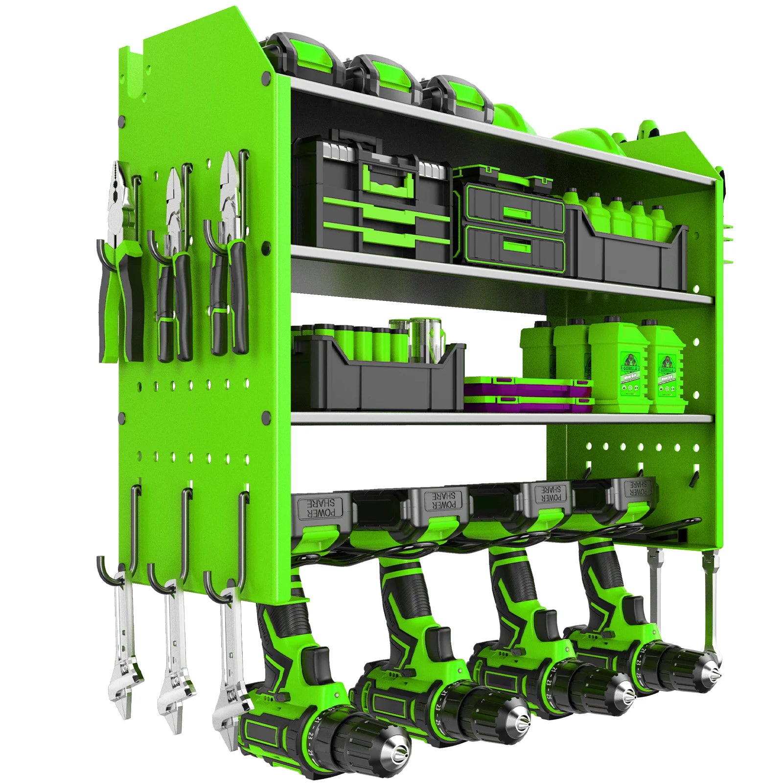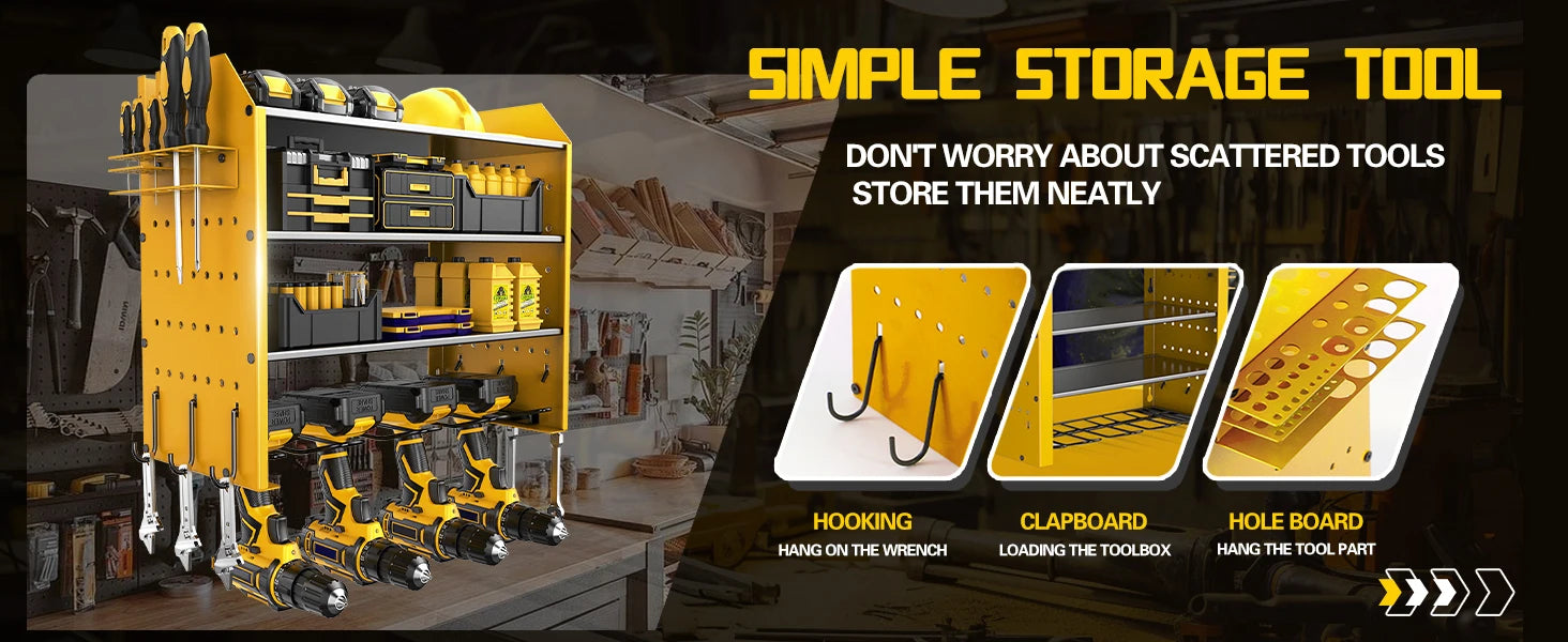 Heavy Duty Power Tool Wall Mounted Organizer Battery Tool Rack with Pegboard Side Racks and Hooks