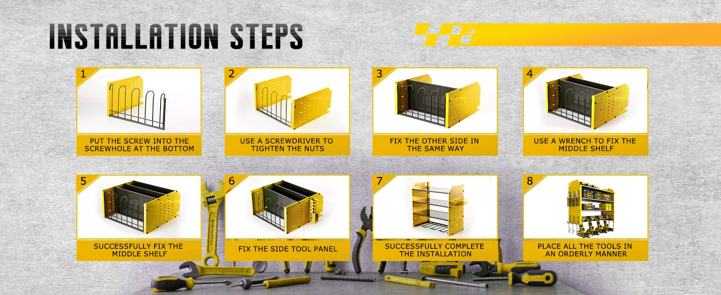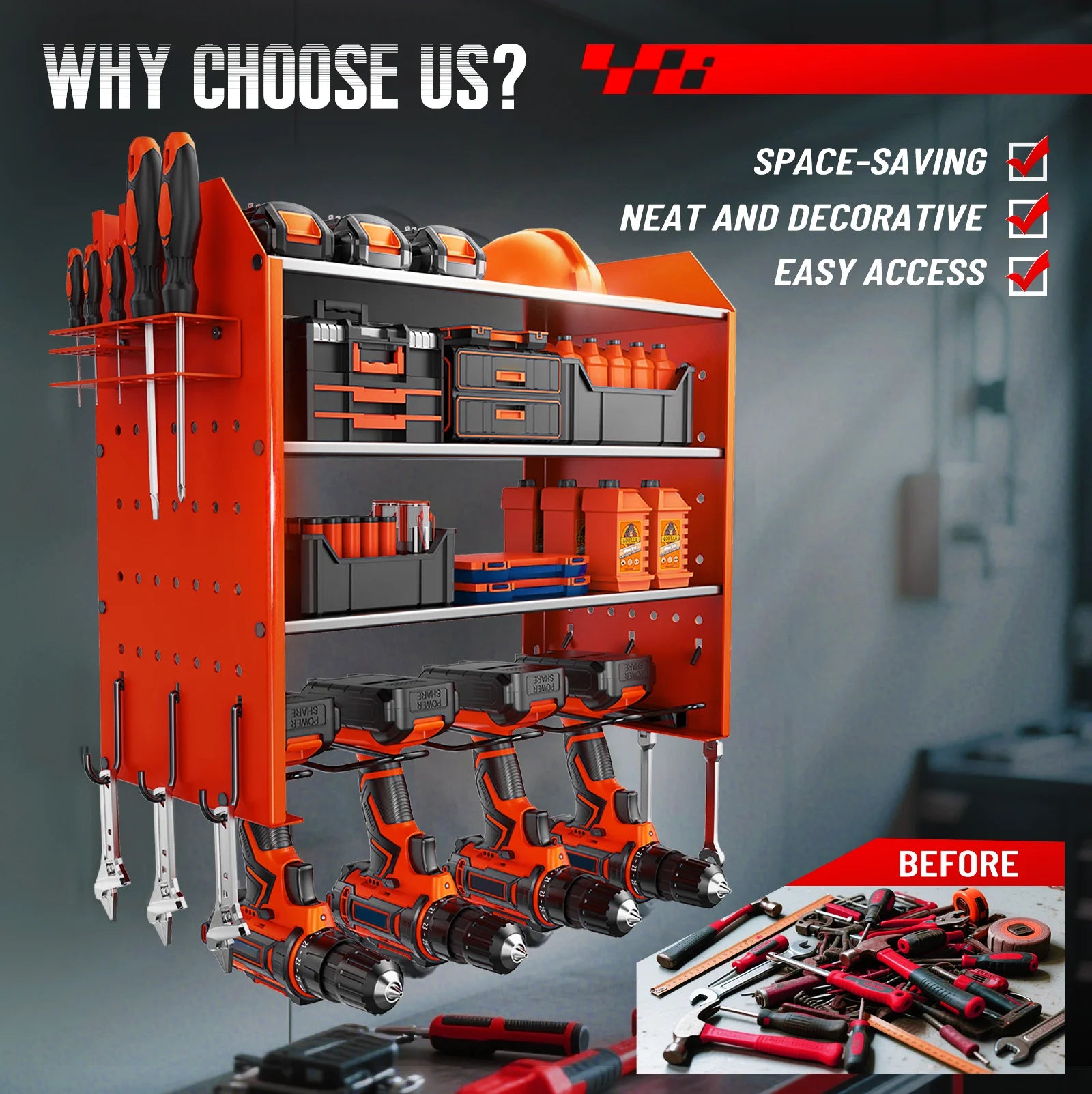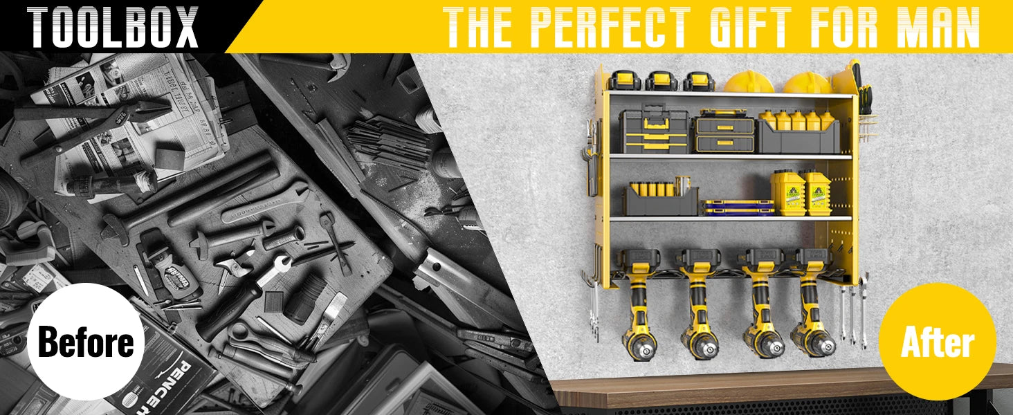 Transform your workspace with this professional-grade tool storage solution. Designed to keep your tools organized and easily accessible, this system maximizes wall space while providing secure storage for power tools, hand tools, and accessories.